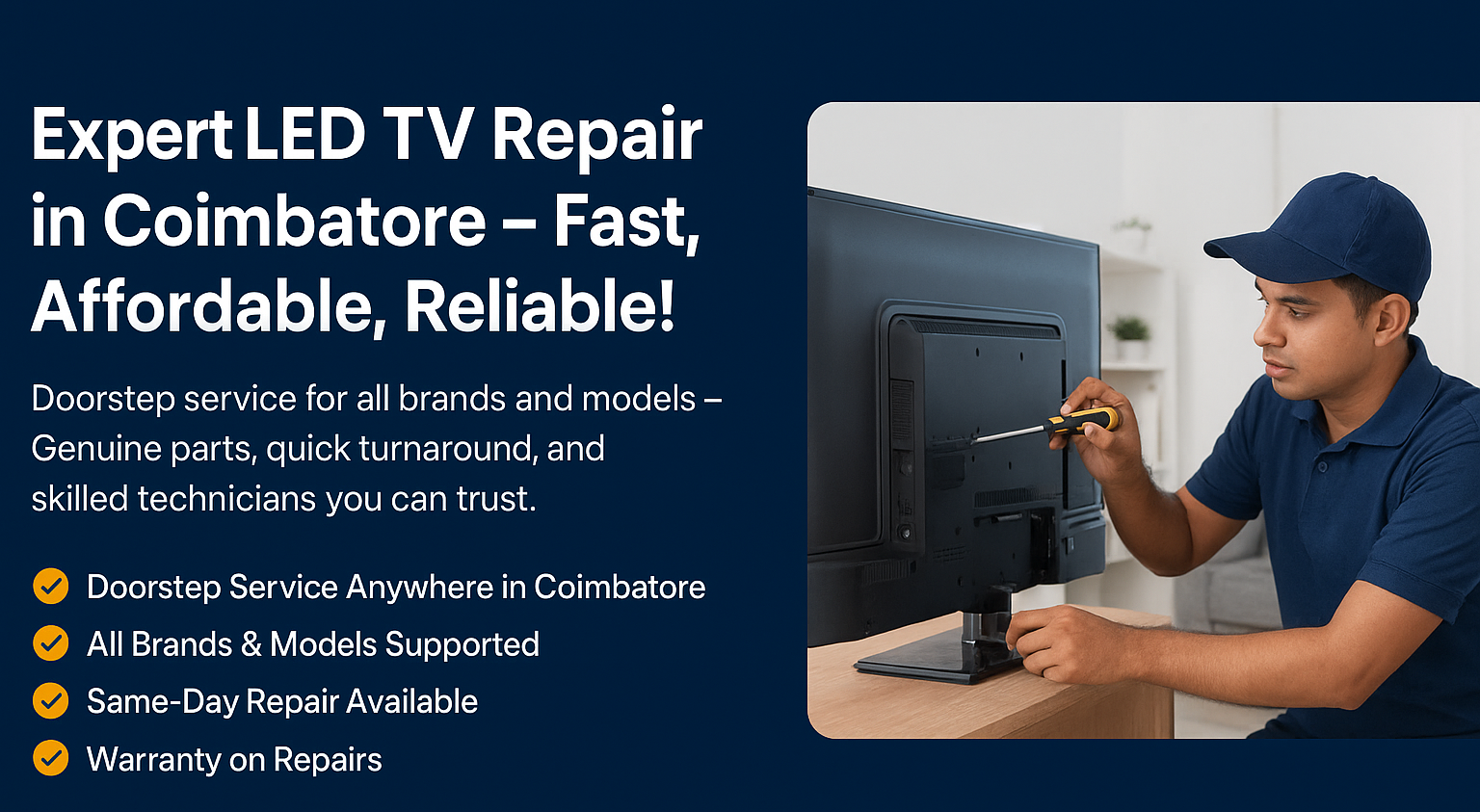 At Sree LED TV Repair Service, we specialize in repairing all types of LED, LCD, and Smart TVs in Coimbatore. With over 10+ years of experience, we have earned the trust of thousands of customers. Our team of skilled technicians ensures quick diagnosis, genuine spare parts, and long-lasting solutions at affordable prices.